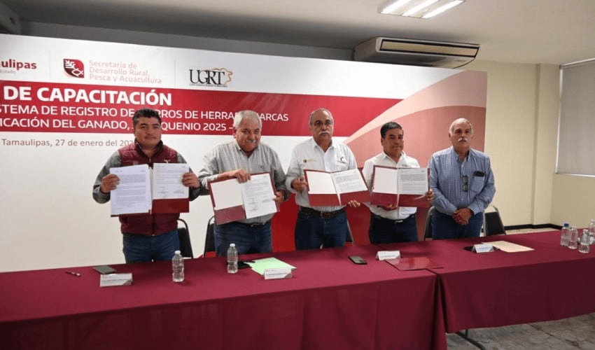 Ciudad Victoria, Tamaulipas.- Con la finalidad de revalidar su registro de fierro y marcas de identificación de ganado, la Secretaría de Desarrollo Rural, Pesca y Acuacultura y la Unión Ganadera Regional de Tamaulipas llevaron a cabo la firma del convenio de colaboración para dar inicio a la revalidación de registros de fierros y marcas de identificación del ganado, quinquenio 2025 – 2029.